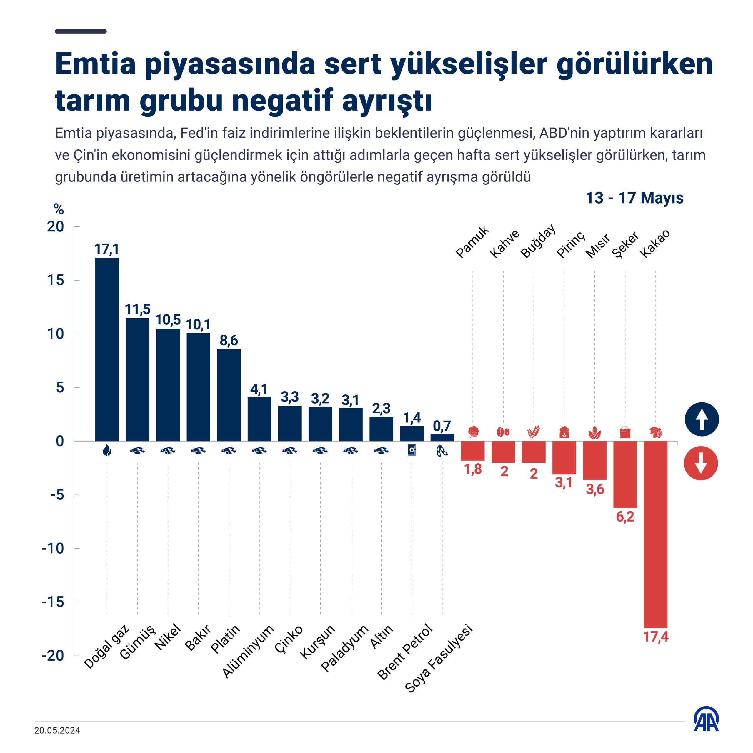 Emtia piyasasında, Fed'in faiz indirimlerine ilişkin beklentilerin güçlenmesi, ABD'nin yaptırım kararları ve Çin'in ekonomisini güçlendirmek için attığı adımlarla geçen hafta sert yükselişler yaşanırken tarım grubunda üretimin artacağına yönelik öngörülerle negatif ayrışma görüldü. ( Mehmet Yaren Bozğun - Anadolu Ajansı )
